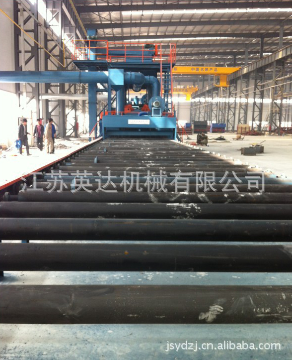 主要由輥道輸送系統(tǒng)、拋丸清理機、拋丸除塵系統(tǒng)、和電控系統(tǒng)所組成。其工作原理是:由輸送輥道送至封閉的拋丸清理室,,利用拋丸器高速旋轉的葉輪將鋼絲切丸(彈丸)加速拋射至工件表面,對工件表面進行沖擊、刮削以清除工件表面的鐵銹和污物,然后利用橫掃、滾刷、收丸螺旋和高壓吹管將工件表面的積丸和浮塵吹掃干凈,由送出輥道送出,從而使鋼材達到除銹、防銹的目的。